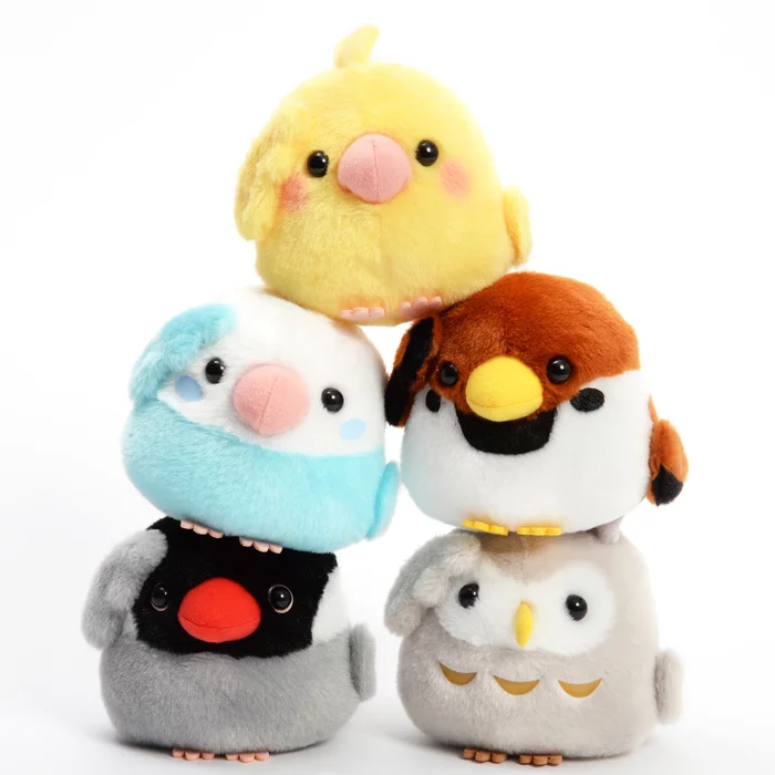 Sir, Kotori Tai bird corp reporting for hug duty! About 3.9” tall, Lutino Cockatiel, Java Sparrow, Blue Budgerigar, Sparrow, and Horned Owl are almost perfectly round and can comfortably salute while held in one hand. If the cuteness of one bird is not enough to get the mission done, just call in the whole squad!