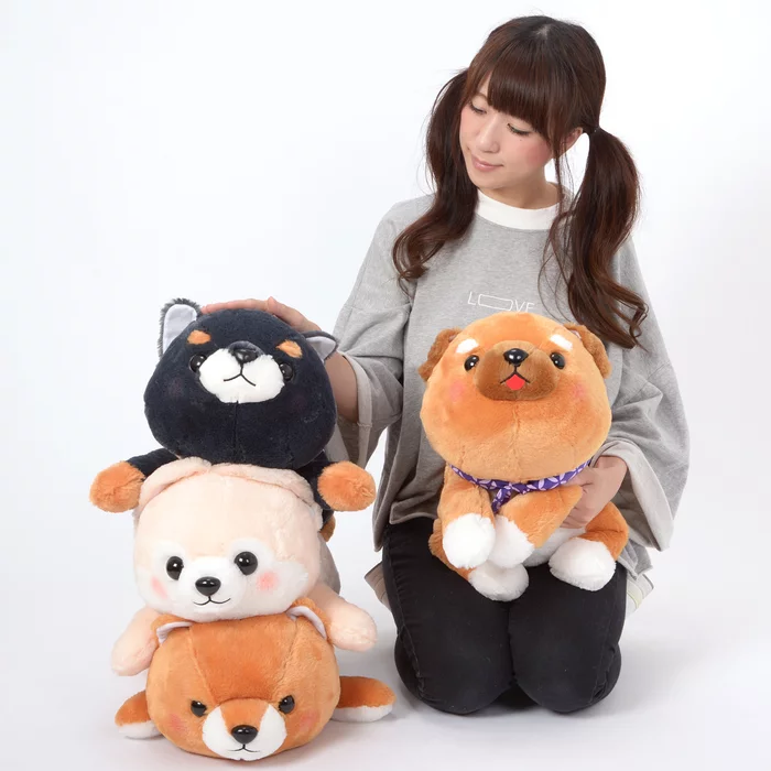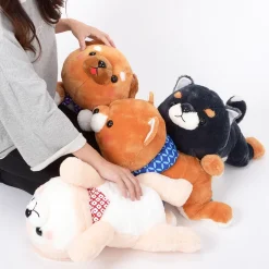 Your favorite Shiba Inu pups have been playing all day, making them so tired they just sprawled on the ground! Mametaro, Mamejiro, Mamesaburo, and Sasuke are about 16.5” long, 8.7” tall, and 8.7” wide, making them perfect to be on the receiving end of your crushing hugs or even as pillows!