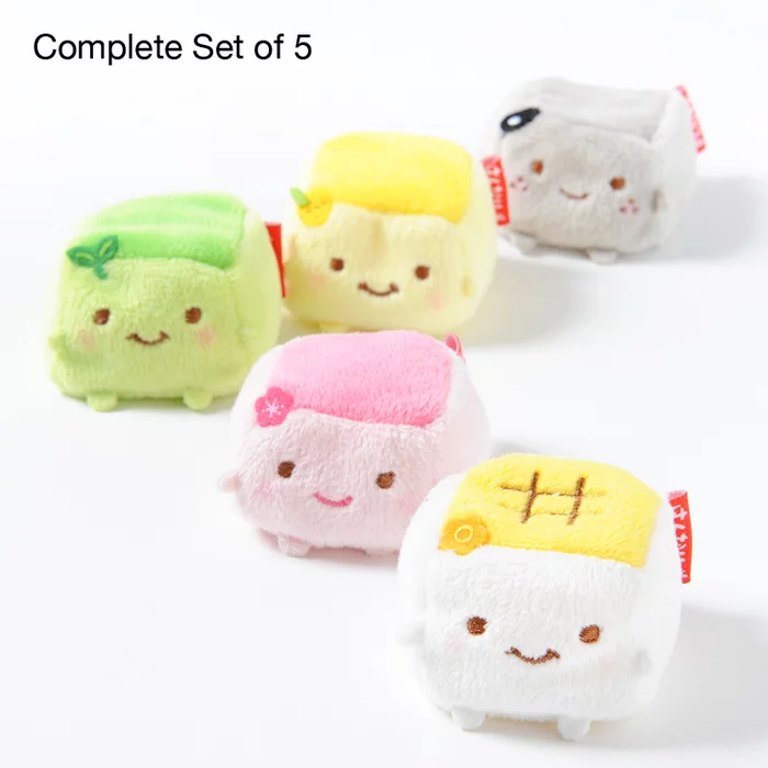 Have you heard of Hannari Tofu? Hannari means “elegant” in the dialect spoken in southern Japan, and Hannari Tofu is certainly a stylish soy-based lifeform and is just as soft and fluffy as its namesake. Now you can enjoy even more Hannari Tofu with half the calories thanks to these tiny “tenori” size versions which are small enough to fit in the palm of your hand! As well as a complete set, there are five different versions available individually: Ume Tofu (pink), Yaki Tofu (white body with a “grilled” yellow top”), Yuzu Tofu (yellow & green), Matcha Tofu (green), and Goma Tofu (black). Each comes with Hannari Tofu’s adorable face embroidered on the front as well as the characteristic decoration on its forehead: a plum for Ume, a star for Yaki, a yuzu fruit (Japanese citrus fruit) for Yuzu, a tea leaf for Matcha, and a tiny black sesame seed for Goma who also has cute freckles on his face! Pick your favorite or stack them up to for an awesome Tower of Terrifying Tiny Tofu Cuteness. Either way, there’s no escaping the adorableness of these mini Hannari Tofu plushies!